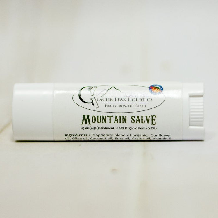 Mountain Salve is made with a proprietary blend of herbs, Plantain, Goldenseal, Oregon grape root, Chickweed, Usnea, Emu oil, Cocoa butter, Vitamin E, Beeswax, and essential oils in a base of sunflower oil, olive oil, and coconut oil.